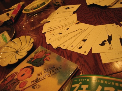 何か、イラストをということで、私もチェコの絵本を出してきたり、ヨガのポーズのカードを並べてみたり。